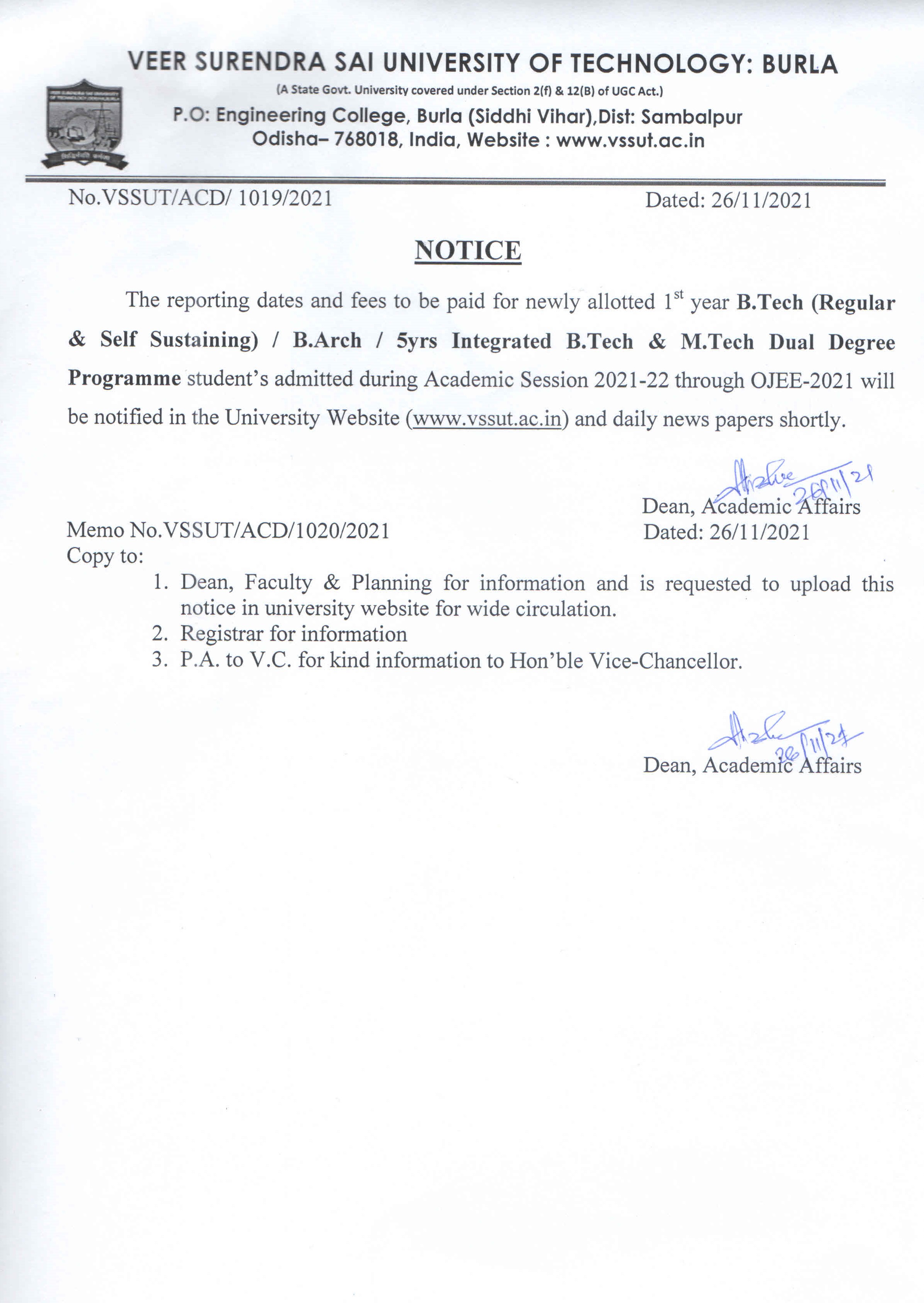 Notice for extension of reporting and admission for 1st Year B.Tech (Regular & Self Sustaining) / B.Arch and 5yrs Integrated B.Tech & M.Tech Dual Degree Programme for the Academic Session 2021-22 |