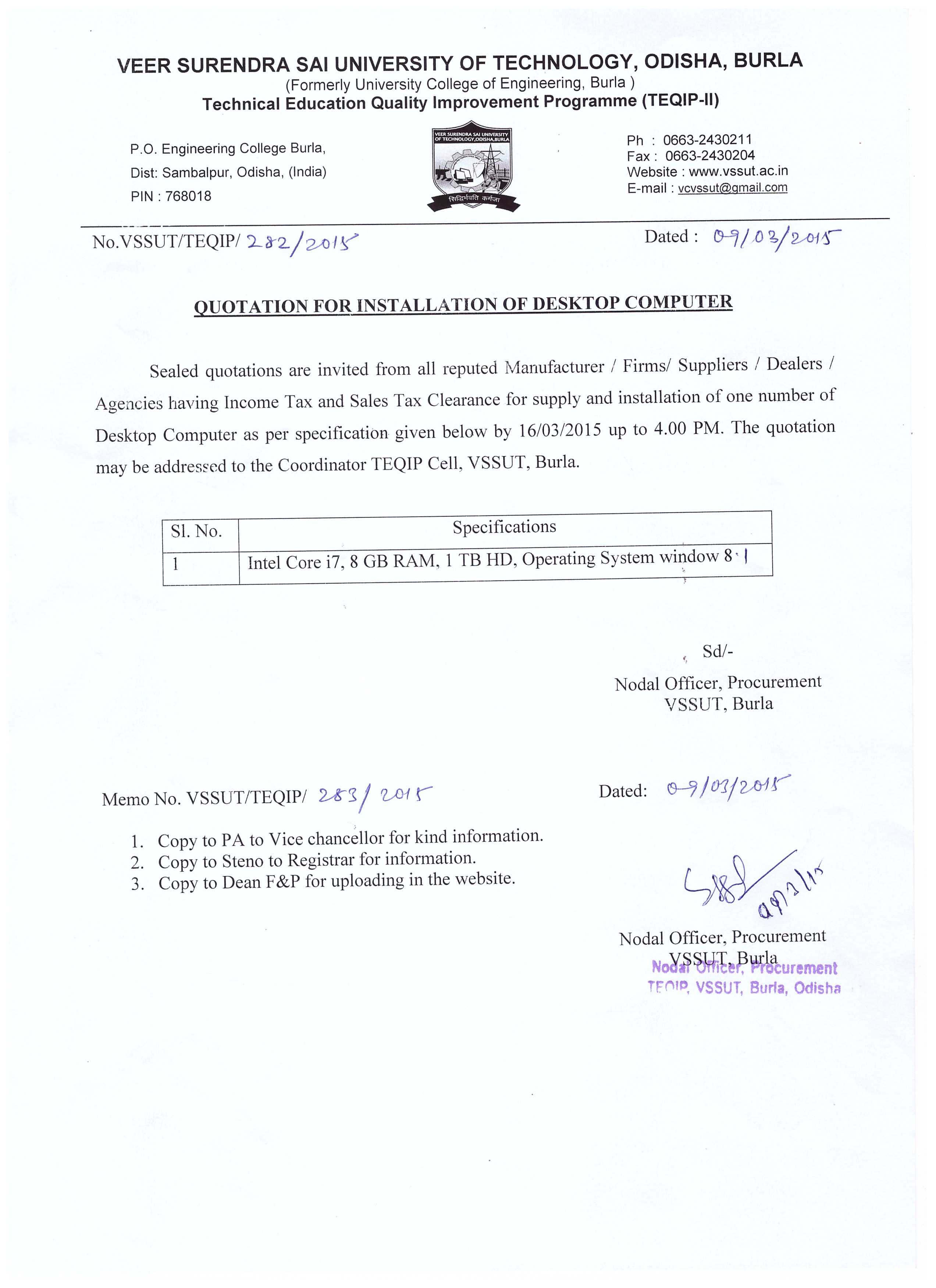Invitation for quotation for installation of printer at TEQIP Cell VSSUT, Burla |