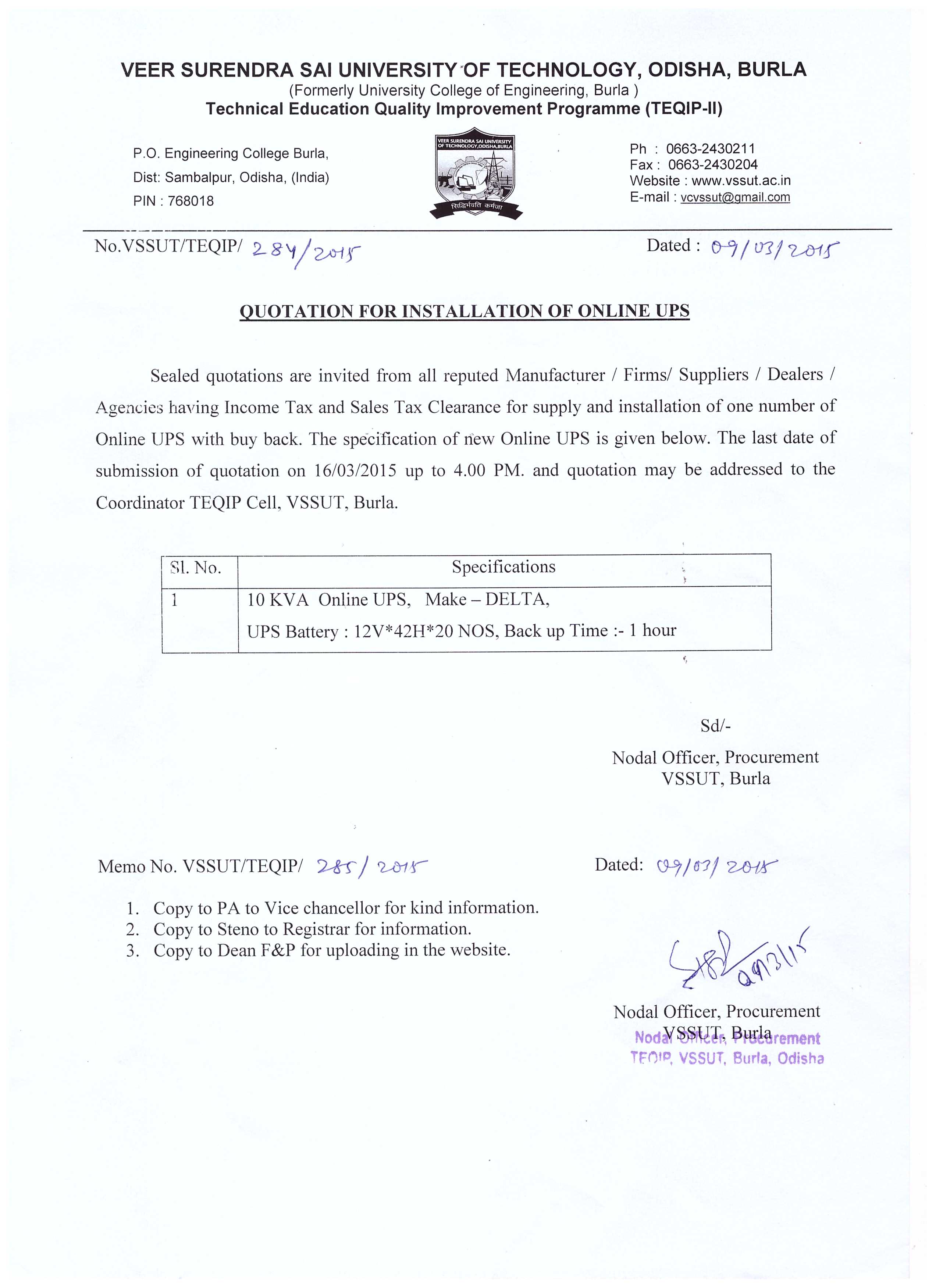 Quotation for Online UPS for Mechanical Engg. Deptt. |