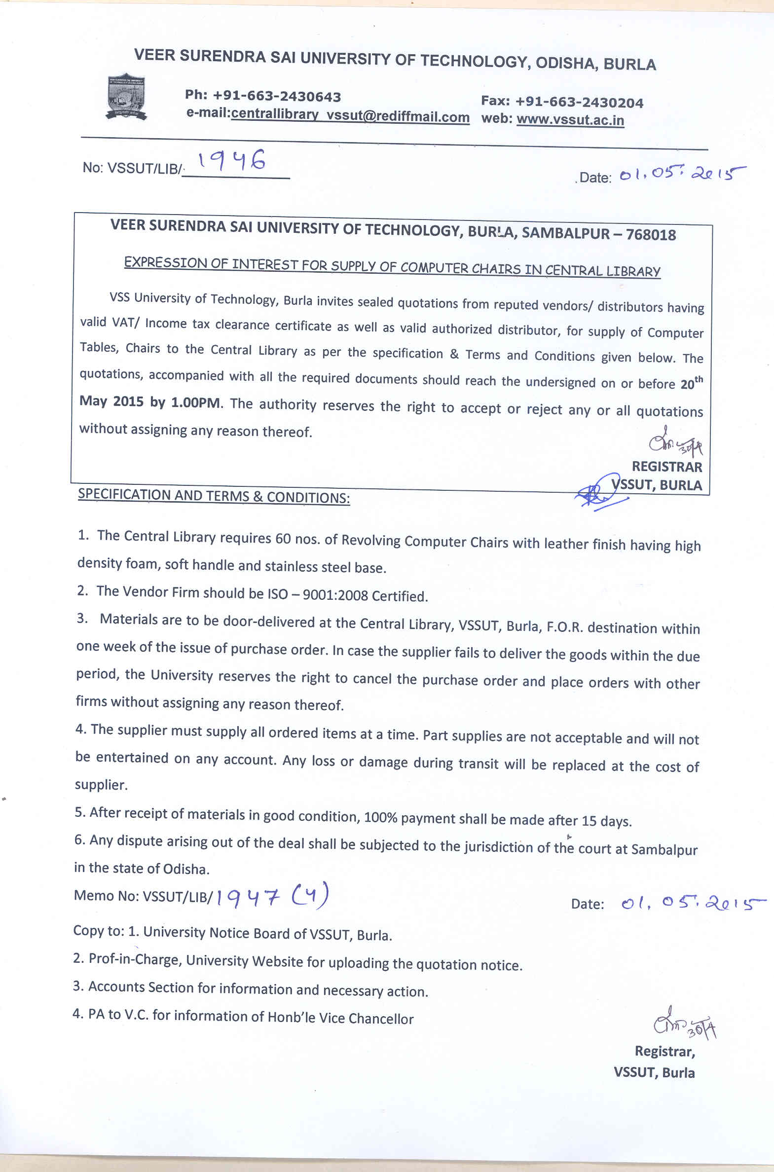 Expression of Interest for Supply of Computer Chairs in Central Library |