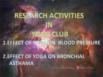 Yoga club organises Yoga classes for the students of first year. In addition to the Internal faculty,Yoga teachers are drawn from different organisations imparting Yoga training. The students are trained to keep their body and mind fit through yogic postures, asanas, pranayams, transcendental meditation and Rajyoqa practice. These classes are arranged in the morning and evening. Interested students, other than the first year are also encouraged to attend Training is imparted to remain free from anxiety, tension etc and to Inculcate virtues and human values Also therapeutic application of yoga to different diseases like acidity, hypertensis etc. are taught.